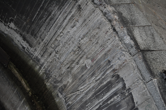 旧ワッカケトンネル江差方坑口のアーチに刻まれた傷、2010-05-23、Iyokanmorigen撮影。