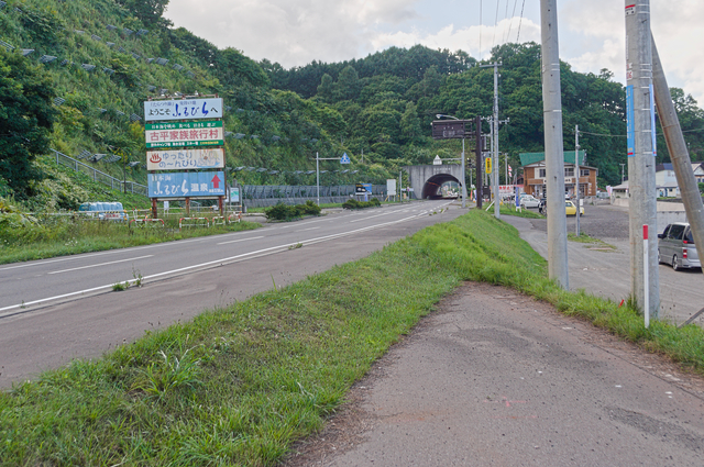 沖歌トンネルの旧道と現道の分岐点、奥は古平トンネル、2013-08-20、Iyokanmorigen撮影。